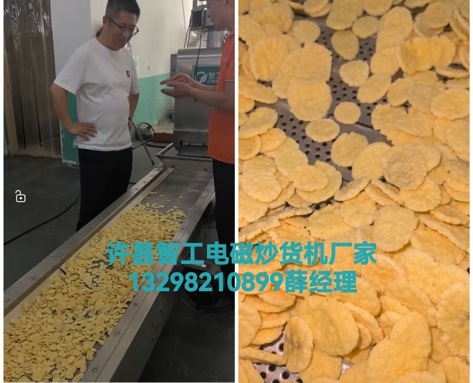 客戶來廠試機(jī)流水線設(shè)備炒制膨化玉米片。